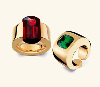 Bagues: Or rose, Grenat et Tourmaline verte.