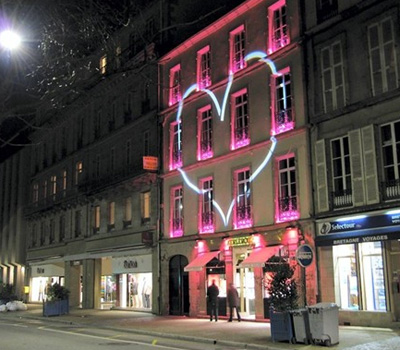 Pour la Saint Valentin, la Bijouterie Kerleroux à Quimper, habille sa façade entière d’un cœur géant lumineux.